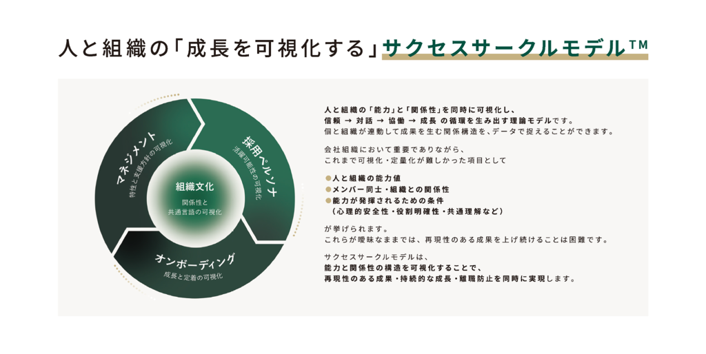 サクセスサークルモデルは、 能力と関係性の構造を可視化することで、再現性のある成果・持続的な成長・離職防止を同時に実現します。