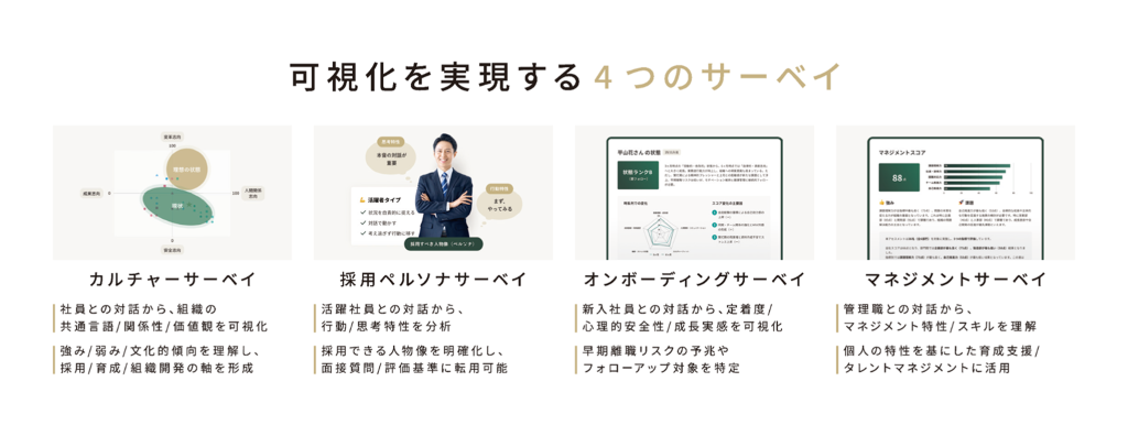 サクセスサークルモデルに基づいて人と組織の「能力」と「関係性」を可視化するために4つのサーベイを用います。4つのサーベイは「採用 → 定着 → 成長 → 文化」という組織の成長循環に紐づいて設計されており、人と組織の一連の変化を一つの理論構造で可視化しています。