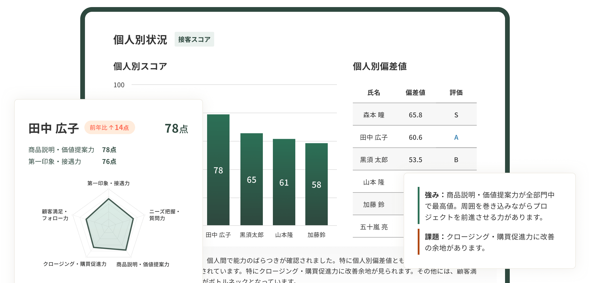 AIとの対話を通じて個人の能力の現在地を客観的なデータで把握します。研修後にもAI診断を実施することで、施策前後での成長度合いを具体的に数値で「見える化」。感覚ではなくデータに基づいた成果を、
